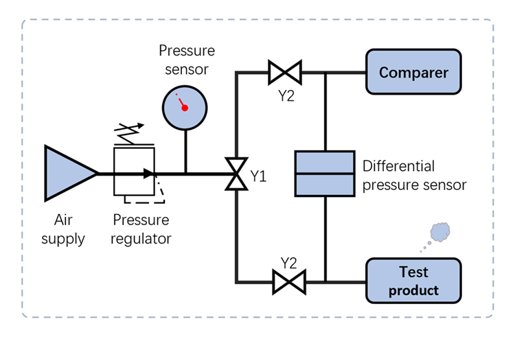 Basic principle: a certain pressure of the gas, while filling into the same volume of the standard workpiece and the workpiece to be measured, close the valve, after balance and stability, measure the air pressure difference between the standard workpiece and the workpiece under test, the difference is the actual leakage value, because the sensor to obtain the air pressure difference value is independent, so the test method is not affected by the inflation pressure and restrictions, and the accuracy is relatively high.